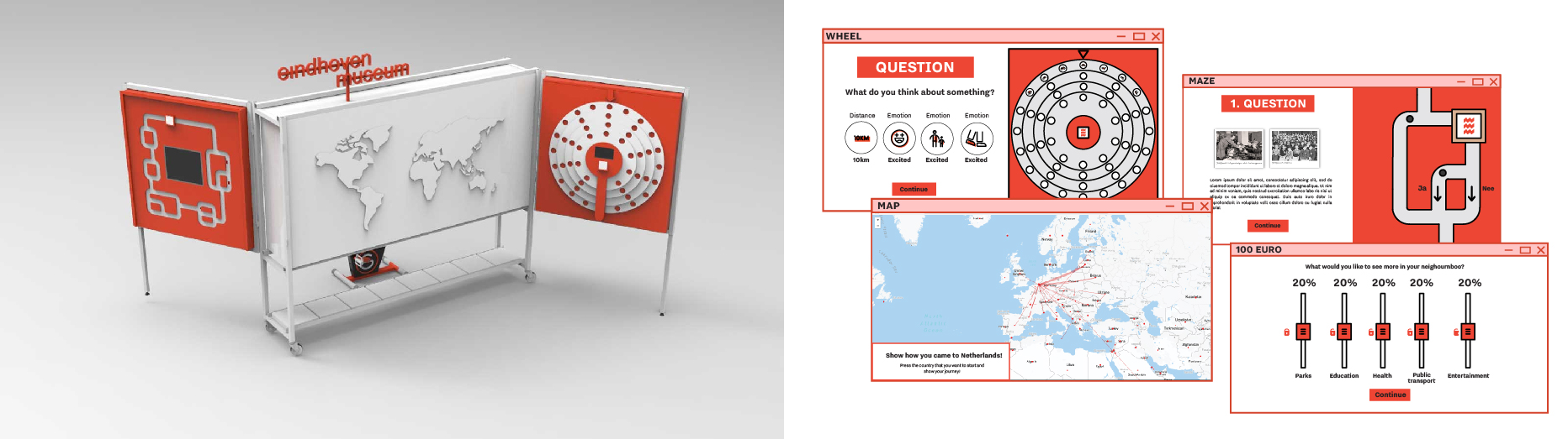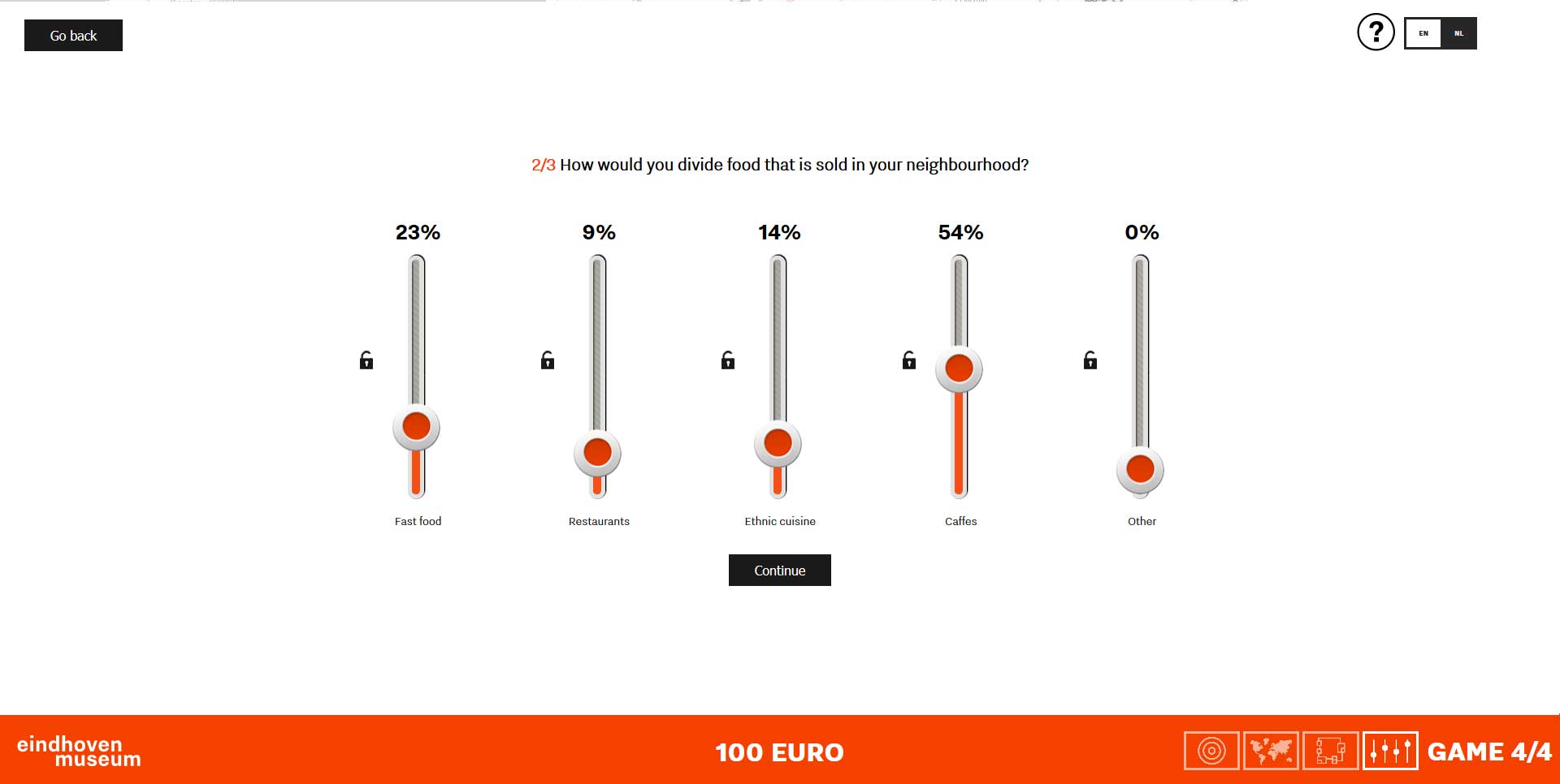The installation asks how the visitor would spend 100 euros in the Eindhoven on the three different fields - mobility, food, and infrastructure.