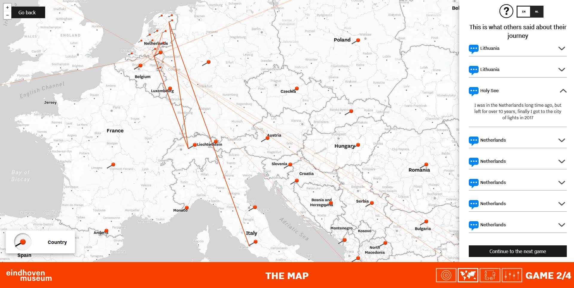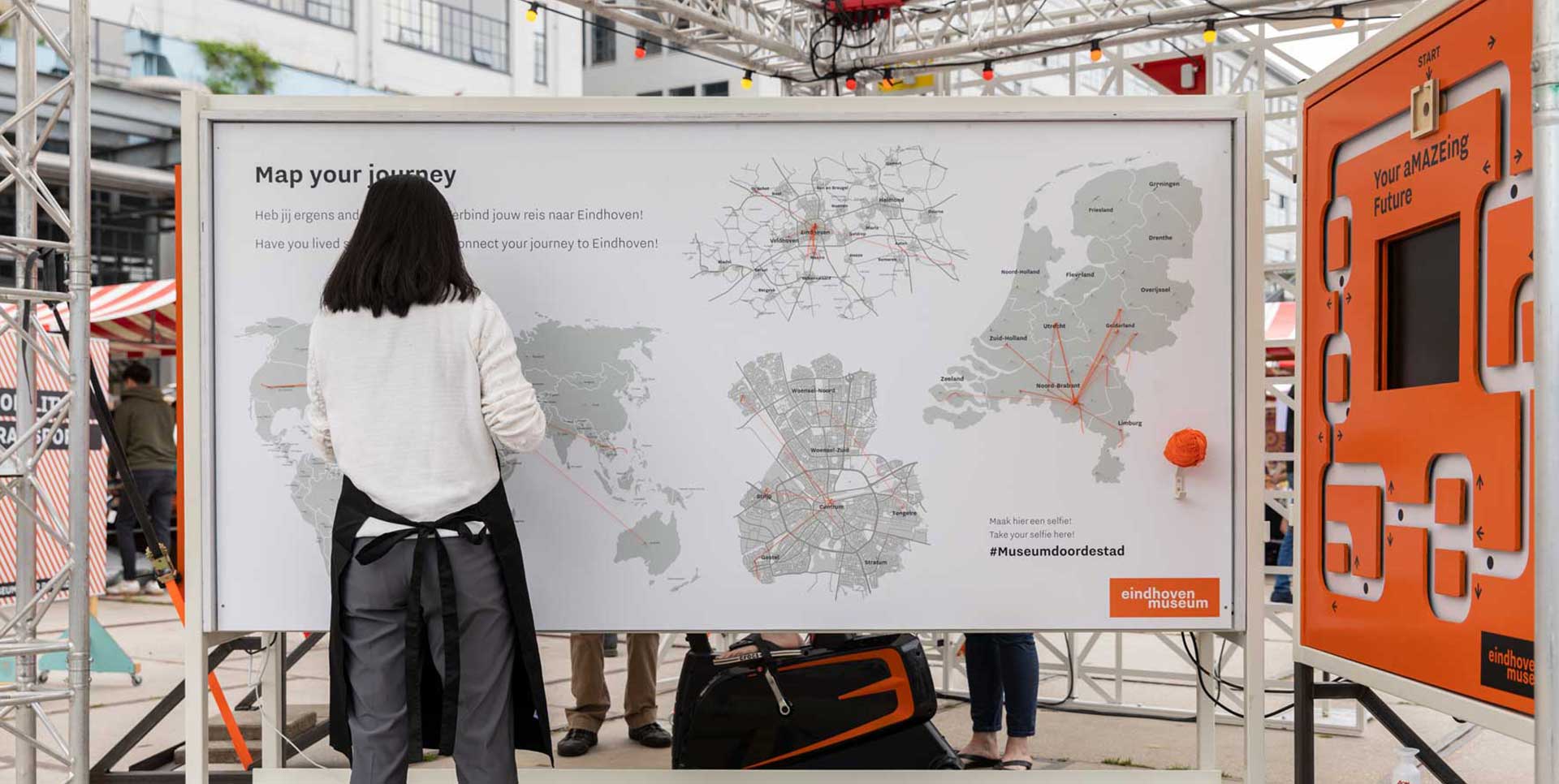 Eindhoven is an international city with people from different cultures and countries. Even the local people have traveled quite a lot all around the world. This installation shows a map with pins and threads which indicates from where people have come to Eindhoven. Visitors also can leave their personal stories about how they came to Eindhoven and why they stayed here.