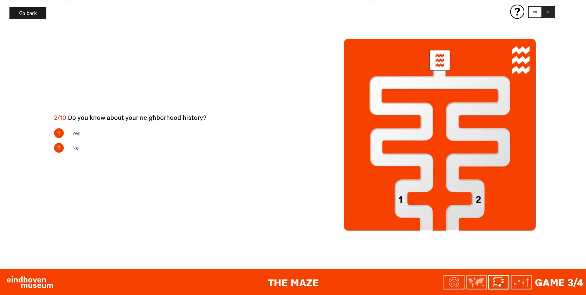 The installation creates a unique way to answer the questions about the Eindhoven city and its history by moving the 'walker' through the right maze track. After each question, visitors can compare their answers with others.