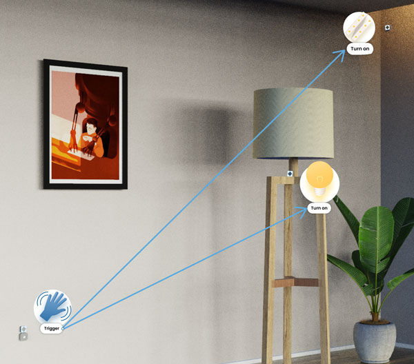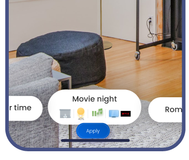 Create the environment that fits your activities or mood, for example, "Movie Night", which could dim the lights in the living room down, pause playing music, lock the door, turn on the TV, and open Netflix on it.