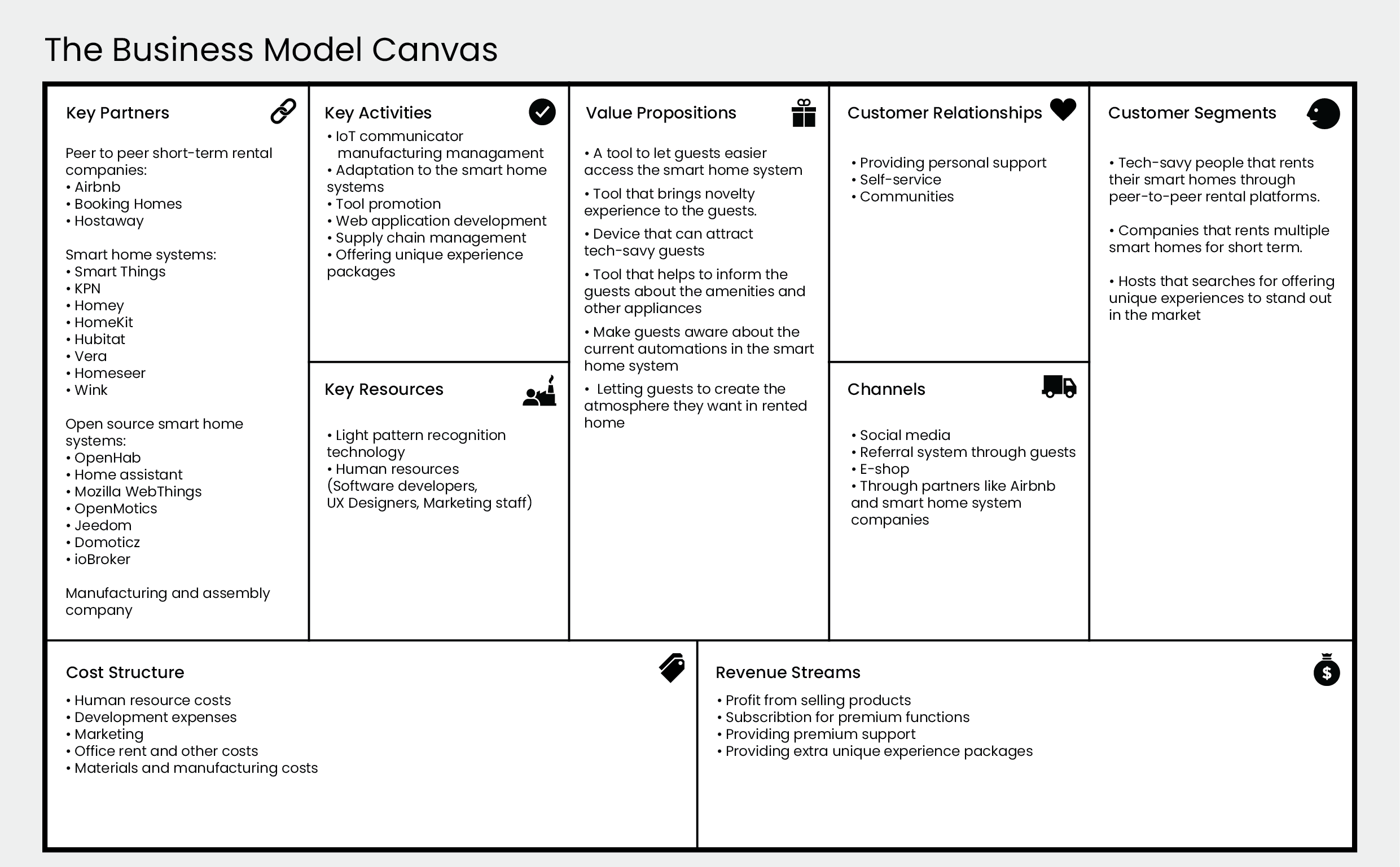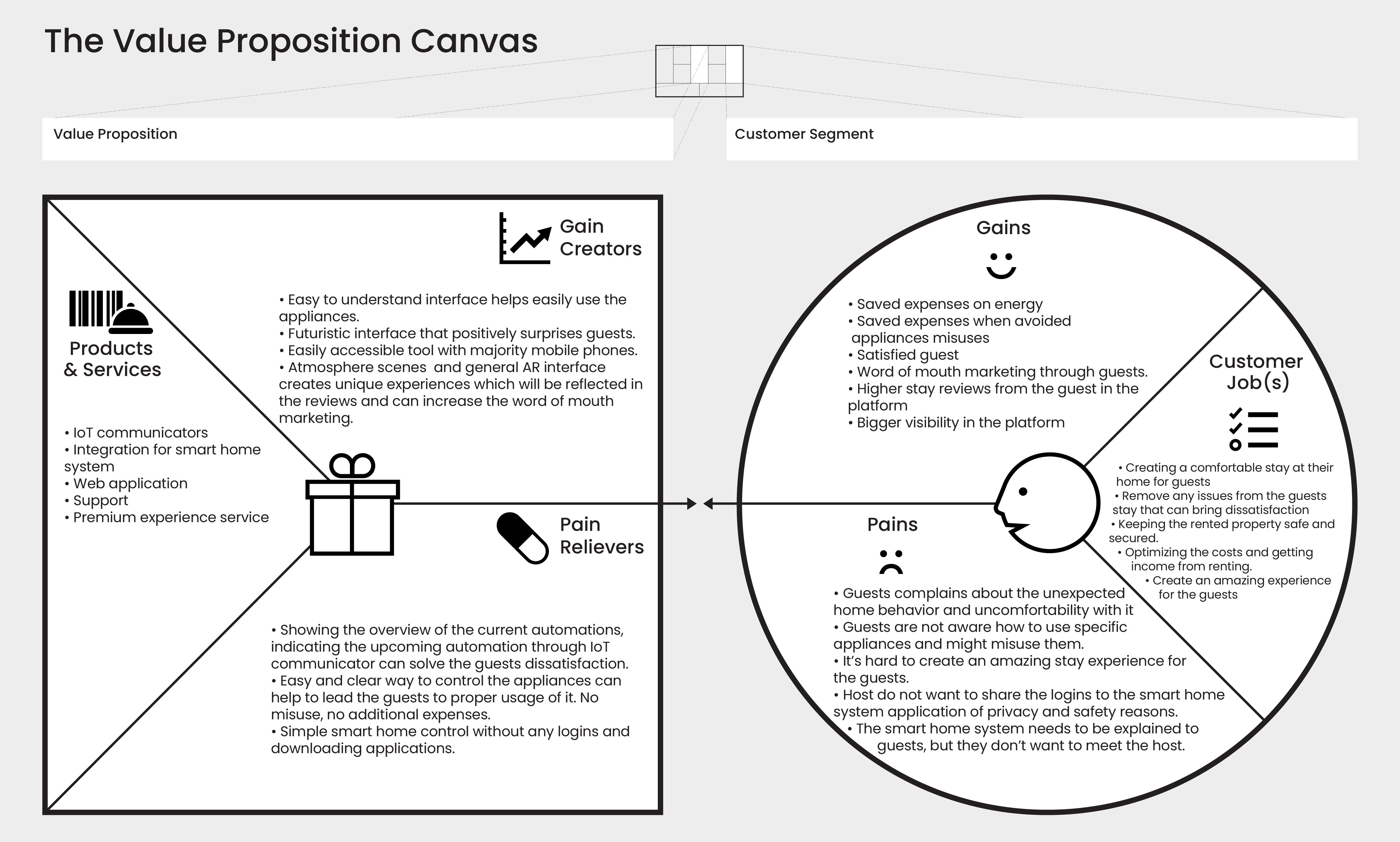 Based on IDEO [5], when building the business it is important to have a harmony of three aspects - desirability, viability and feasibility . In this Airbnb and Smart home context at first it is important to understand the desirability part. At the beginning, to be sure that “Smart ARbnb” is positioned around the host needs and values, the Value proposition canvas and business model canvas are made which can be seen below: