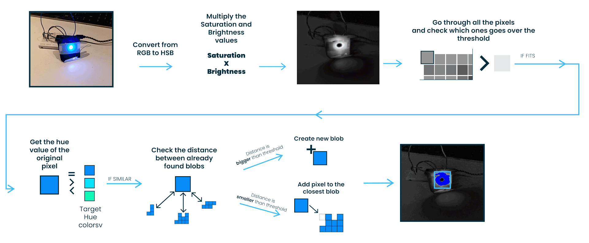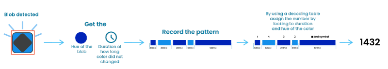 For this project to work, web application needs to be able to read the blinking pattern of IoT communicator through the mobile camera. It is achieved by taking each frame of camera footage, scanning for pixel clusters - blobs, selecting the ones that fits in the specific thresholds and finally, recording the pattern. The pattern later is decoded and the smart appliances information and settings are taken from the smart home system.