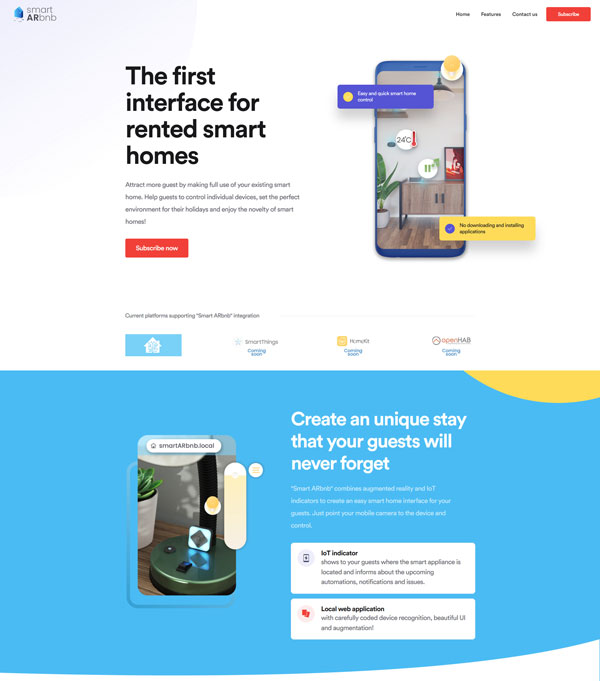 In this project I conducted a research about the Airbnb and smart home systems context, created, prototyped, and evaluated smart home interfaces with augmented reality and visible light communication. The design concept and prototype were developed which would use a mobile web browser to detect light blobs and patterns through mobile camera to receive information from the IoT communicators and show augmented smart appliances control on the screen. While the user study showed that the feeling being around IoT communicators blinking is slightly negative and the user interface of the web application has some understandability issues, the overall experience of the interaction and system appears to be positive and users would like to see “Smart ARbnb” system inside the next Airbnb accommodation place. In future work, IoT communicators design needs to be prototyped and its feasibility checked out, the web application user interface should be revised and evaluated regarding the understandability of the automation overview and onboarding. In addition, the business case should be evaluated with more Airbnb hosts and additional benefits should be found to increase the value proposition.