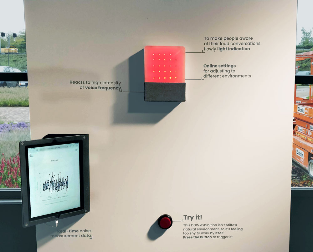 After long discussions we created a device that indicates the high noise level and tries to change peoples bahaviour. Stilte targets only voice frequency and indicates with a red light when it is too intesive and can be disturbing other colleagues.