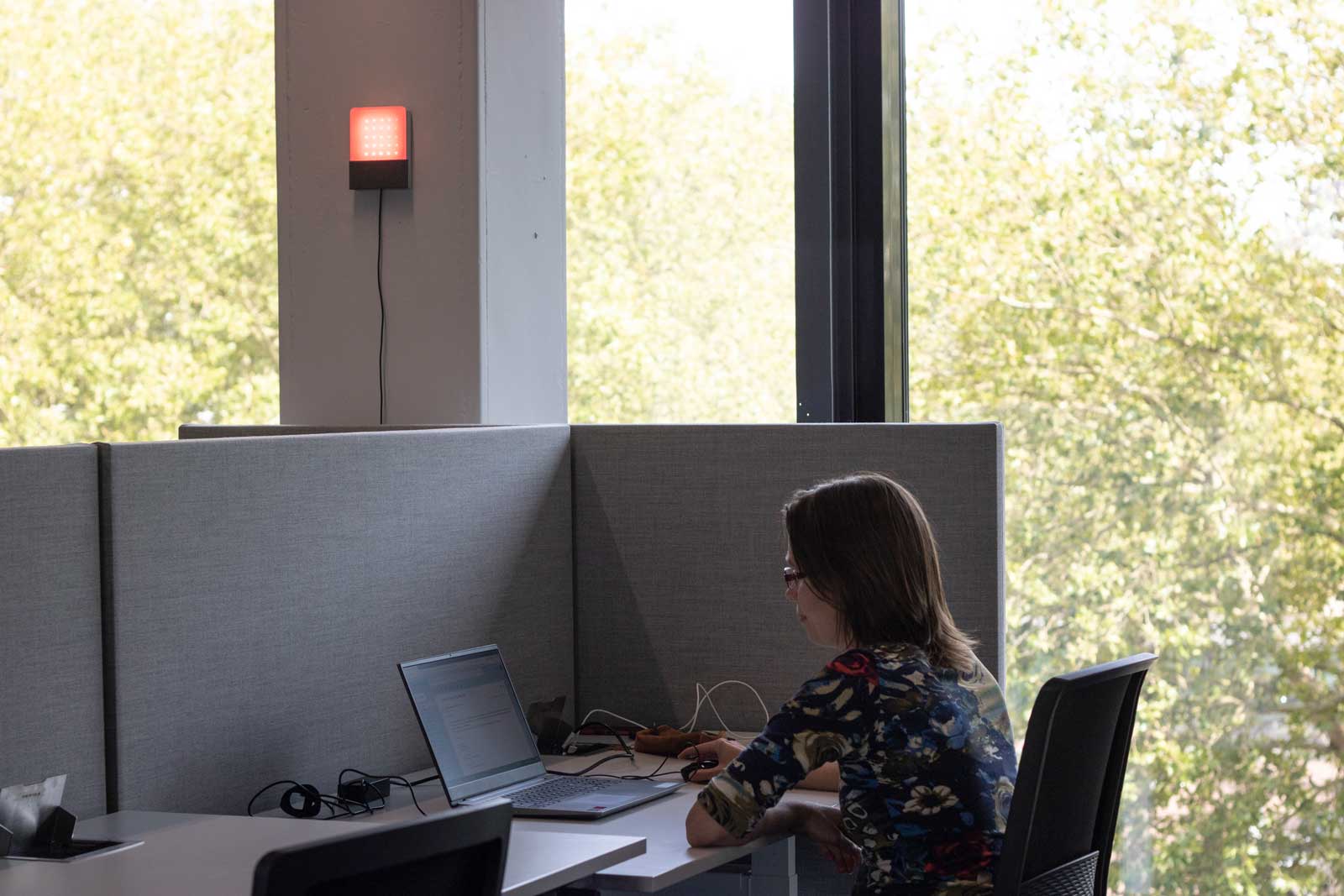 Numerous studies have shown that conversational background noise increases secretions of stress hormones, leading to health issues, and reduces productivity by up to 66%. Our product, is a device that reacts to noise levels in the environment by emitting a red light when the decibels exceed a predetermined threshold. The light acts as an objective visual cue that nudges people to be more aware of how their conversations may be disturbing others.